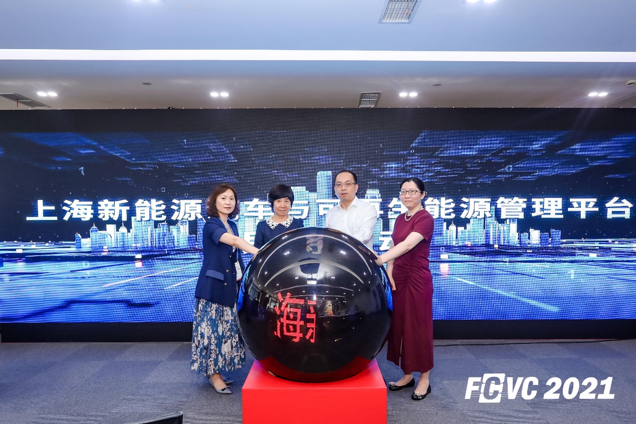 由 副秘书长王菊、上海市经济和信息化委员会智能制造推进处副处长陈可乐、嘉定区经济委员会副主任徐慧、上海国际汽车城(集团)有限公司党委委员管清平共同上台启动发布“上海市新能源汽车和可再生能源平台”。